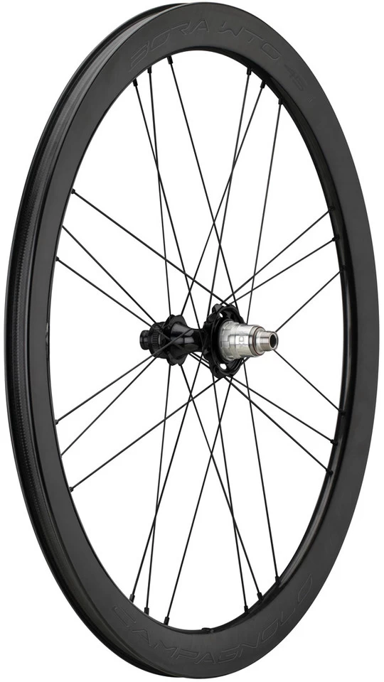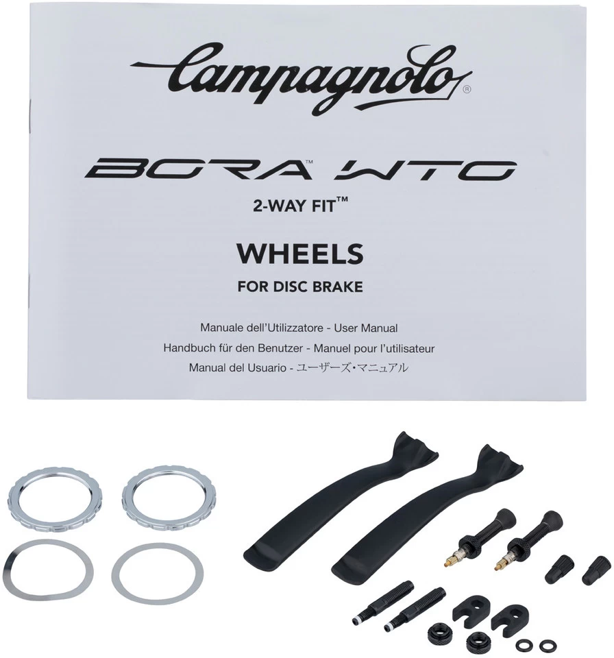 Freehub:SRAM XDRGearing:11-/12-speedNote:A 1.8 mm spacer is required to mount XD cassettes on an XDR freehub.Manufacturer Number:WH20-BOWTODFR45SDKContents:1 x Campagnolo Bora WTO 45 Disc Center Lock wheelset (front and rear)2 x Campagnolo tubeless valves, 35 mm2 x Campagnolo valve extensions, 35 mm2 x Campagnolo reducers for valves2 x tyre lever