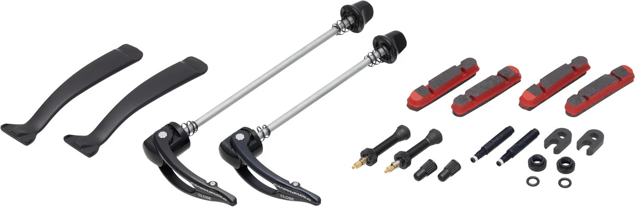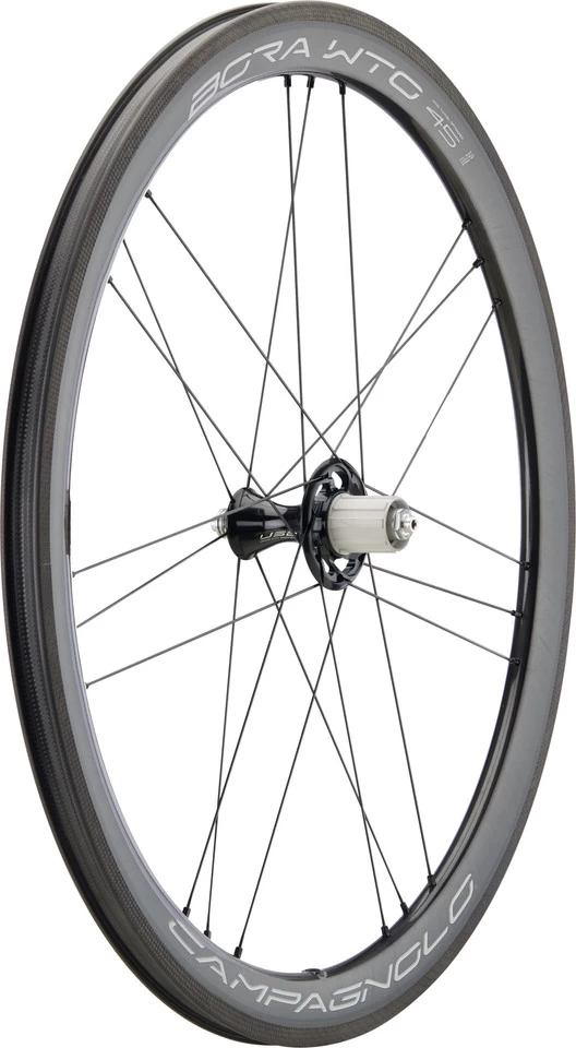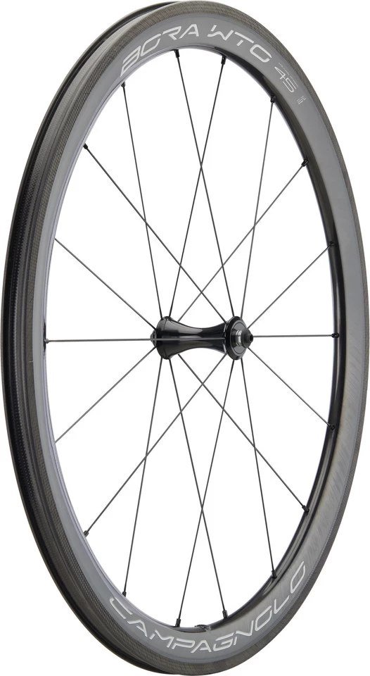 Freehub:Shimano RoadGearing:8-/9-/10-/11-/12-speedNote:The assembly of 8-/9-/10-speed cassettes on a Shimano Road Rotor requires a 1.85 mm spacer.Manufacturer Numbers:WH20- BOWTOFR45XDK (black-dark label), WH20- BOWTOFR45X (black-bright label)Contents:1 x Campagnolo Bora WTO 45 Carbon Wheelset (front and rear wheel)2 x Campagnolo wheel bags2 x pairs Campagnolo brake pads2 x tubeless valve2 x valve extender2 x tyre lever
