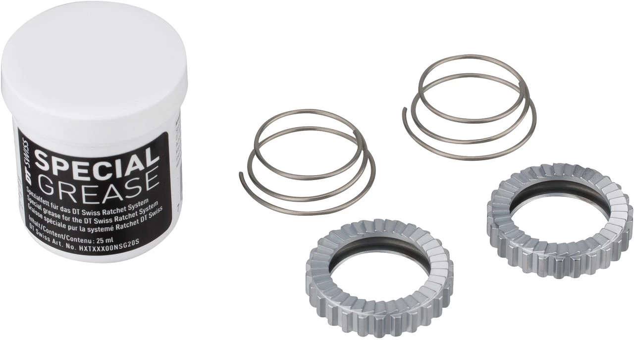 Contents:2 x DT Swiss ratchet2 x DT Swiss spring1 x DT Swiss special grease for Ratchet System, 25 ml