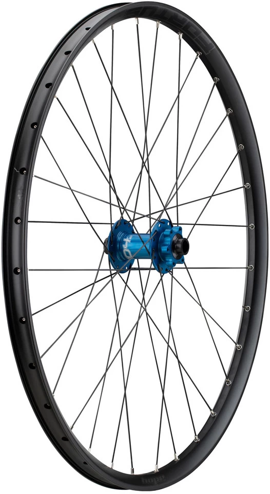Note:The shipping time for wheels with coloured hubs (all colours except black) can take up to 8 weeks.Specifications:Application:EnduroWheel Size:29″Tyre Type:clincher tyreNumber of Spokes:32Brake Type:6-bolt discTubeless System:Tubeless ReadyTechnical Information – Rim:Type:Hope FortusDimensions (ETRTO):26-622Inner Width:26 mmOuter Width:31 mmDepth:20 mmERD:600 mmValve Hole Diameter:SV / Presta (6.5 mm)Rim Material:aluminium (6061-T6)Technical Information – Front Hub:Type:Hope Pro 4Over Locknut Dimension:15 x 100 mm thru-axleBearings:cartridge, stainless steel (sealed)Body Material:aluminium (2014-T6)Technical Information – Rear Hub:Type:Hope Pro 4Over Locknut Dimension:10 x 135 mm quick release, can be converted to 12 x 142 mm thru-axleBearings:cartridge, stainless steel (sealed)Body Material:aluminium (2014-T6)Freehub Body Material:aluminiumFreehub Body:ratchet system (4 pawls) w/ 44 tooth engagement (8.2°)Technical Information – Lacing:Front Lacing Pattern:3-crossRear Lacing Pattern:3-crossSpoke Type:Sapim Race / J-bend / double buttedSpoke Size:291 mm/292 mm (front wheel l/r), 292 mm/291 mm (rear wheel l/r)Spoke Material:stainless steelNipple Material:brassApproved For:Air Pressure (max.):4.1 barRecommended Tyre Width:2.25″ – 2.5″Features:wider rim than the Tech wheelstable and stiff, but weight optimized (580 g rim only)rim eyeletslarger flange diameter on hub bodyWaterslide decalsmachine made and hand finished in Barnoldswick (UK)tubeless tape and valves required for tubeless setup (incl.)Colour Index:The first component of the colour indicates the hub, the second the rim (always black). The decals are black (stealth), the spokes black, the nipples silver.