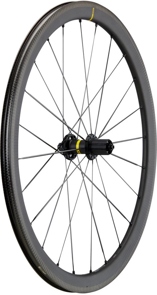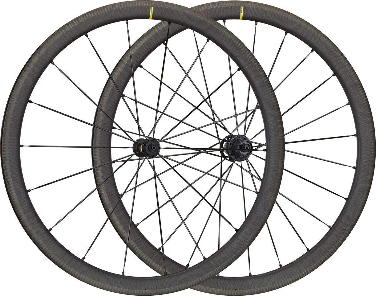 Specifications:Application:Road, Triathlon & Time TrialWheel Size:28″Tyre Type:clincher tyreNumber of Spokes:18 (front), 20 (rear)Brake Type:rim brakeTubeless System:UST Road TubelessTechnical Information – Rim:Rim Flange:with hookDimensions (ETRTO):19-622Inner Width:19 mmOuter Width:26 mmDepth:40 mmValve Hole Diameter:SV/Presta (6.5 mm)Rim Material:CarbonTechnical Information – Front Hub:Type:Mavic InfinityOver Locknut Dimension:9 x 100 mm quick releaseBearings:self-aligning sealed cartridge bearingsBody Material:aluminiumTechnical Information – Rear Hub:Type:Mavic InfinityOver Locknut Dimension:10 x 130 mm quick releaseBearings:self-aligning sealed cartridge bearingsBody Material:aluminiumFreehub Body Material:aluminiumFreehub Body:Instant Drive 360Technical Information – Lacing:Front Lacing Pattern:radialRear Lacing Pattern:IsopulseSpoke Type:straight pull / double-buttedSpoke Size:277 mm (front), 285 mm/266 mm (rear l/r)Spoke Material:steelNipple Type:Fore, integratedNipple Material:aluminiumApproved For:Weight Limit:120 kg total weight* (rider, gear & bike)Air Pressure (max.):see specifications on wheel and tyre (if different take the lower value)Recommended Tyre Width:25 – 32 mm