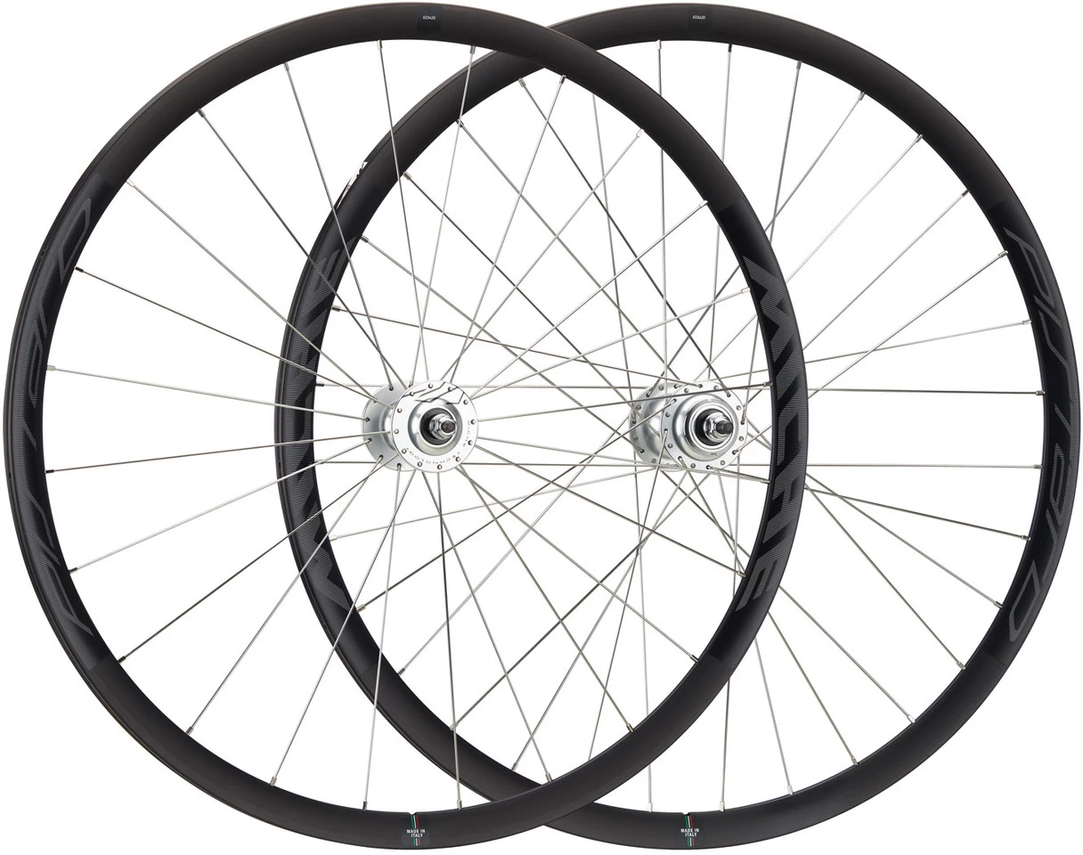 Specifications:Application:TrackWheel Size:28″Tyre Type:tubularNumber of Spokes:24 (front), 32 (rear)Brake Type:noneTechnical Information – Rim:Dimensions (ETRTO):20-633Rim Width:20 mmDepth:28 mmValve Hole Diameter:SV / Presta (6.5 mm)Rim Material:aluminiumTechnical Information – Front Hub:Type:Miche high flangeBearings:MicheOver Locknut Dimension:9 x 100 mm threaded axleBody Material:aluminiumTechnical Information – Rear Hub:Type:Miche high flangeBearings:MicheOver Locknut Dimension:10 x 120 mm threaded axleBody Material:aluminiumTechnical Information – Lacing:Front Lacing Pattern:radialRear Lacing Pattern:radial (left), 2-cross (right)Spoke Type:round / J-BendSpoke Material:stainless steelNipple Material:brassApproved For:Weight Limit:110 kg rider weight + accessoriesRecommended Tyre Width:21 – 25 mmFeatures:exclusively for railway use (ASTM category 1)forged aluminium hubs with sealed, low-friction bearingsSinglespeedmatt finishColour info:black-silver:
