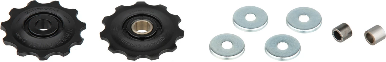 These Shimano derailleur pulleys (pair of idler and tensioner pulley) are compatible with the Deore 10-speed rear derailleur RD-M6000, with the GS or SGS cage depending on the version. Both derailleur pulleys have 11 teeth.