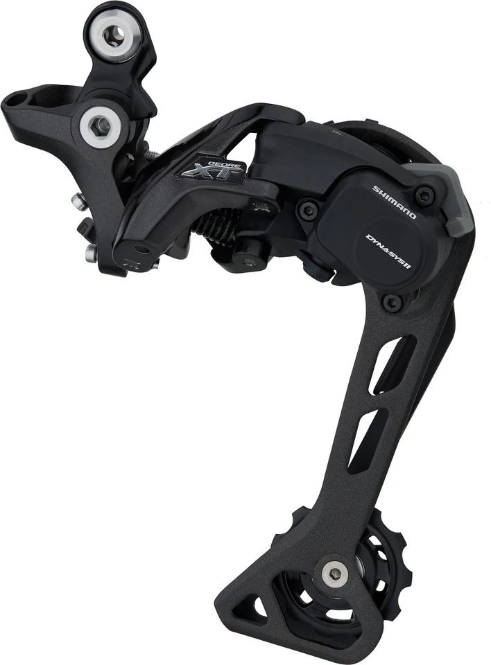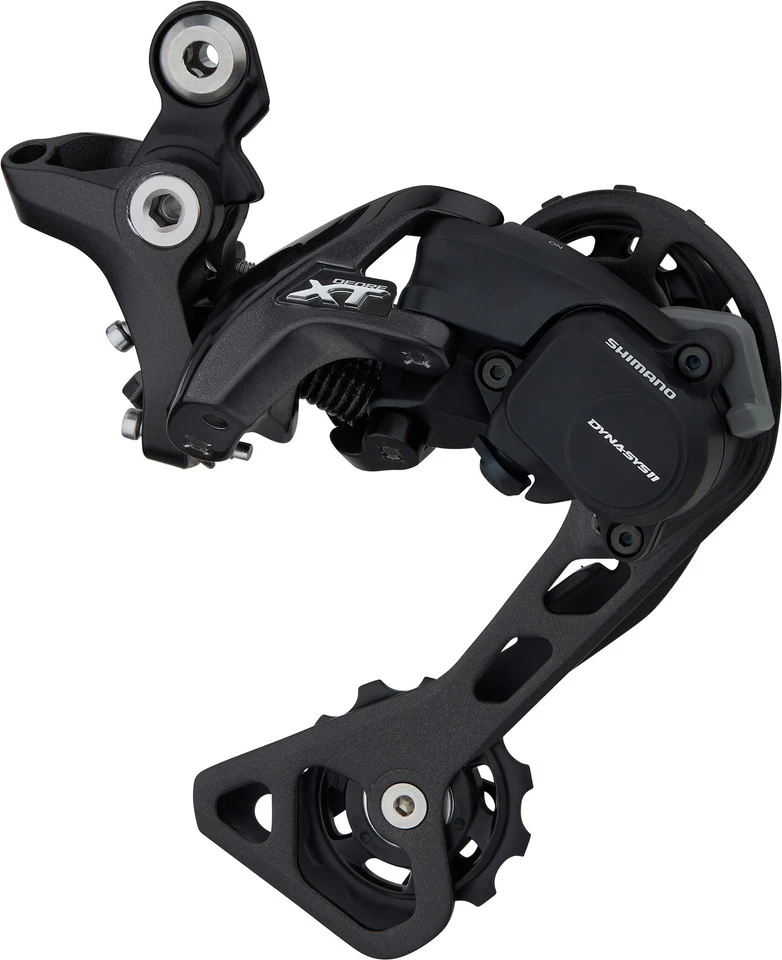 The Shimano XT RD-M8000 rear derailleur features a Shadow Plus mechanism that allows you to switch between maximum chain stability and minimum operating forces. The extremely low profile and the flat angle of attack also benefit safety on difficult, narrow trails. In addition, compared to its predecessors, the RD-M8000 knows how to handle a slanted chain better and has larger derailleur pulley teeth for even smoother shifting performance. In the Dyna-Sys11 system, it thus performs its service efficiently and permanently. Both cages of the rear derailleur are made of lightweight aluminium. The shorter version (GS) is compatible with 1×11 and 2×11-speed gears and cassettes up to 46 or 42 teeth. In the long version (SGS) it can also be used for 3×11-speed drivetrains with an 11-40 cassette.