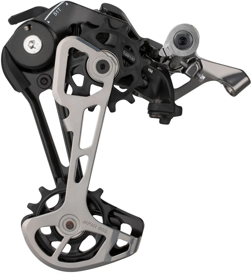 short / GS: 10-45 T: CS-M9101-12, CS-M9100-12, CS-M8100-12, CS-M7100-12long / SGS: 10-51 T: CS-M9101-12, CS-M9100-12, CS-M8100-12, CS-M7100-12, CS-M6100-12Chain:CN-M9100, CN-M8100, CN-M7100, CN-M6100E-Bike:EP8 EP800 for MTB / City & Touring, STEPS E8080Features:lower preload in the lower gears to avoid too high of a chain tensionadditional stop on the shift rocker for low-noise drivetrainlarger 13 T upper pulleyGS version with 28 mm more ground clearancecage plates painted/anodised8 pivot bushings, fluorine-coatedderailleur pulley bearings sealedTechnology:Shadow RD+